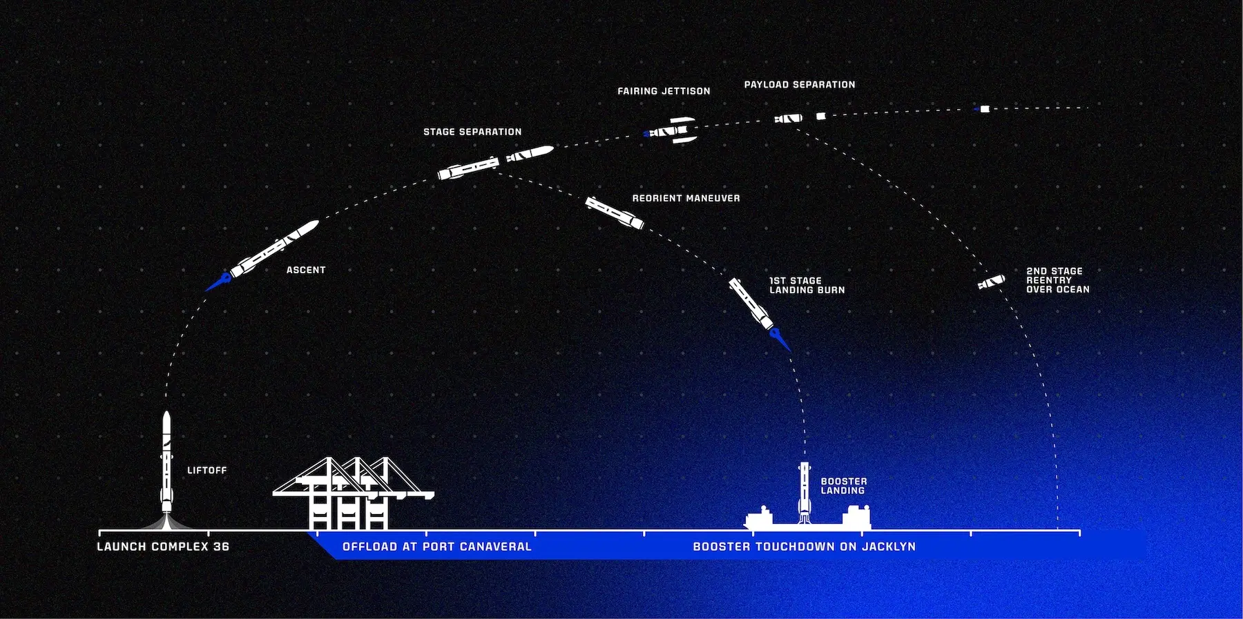 This schematic diagram outlines the full mission profile of an orbital rocket launch It traces the vehicles journey from liftoff at launch complex 36 through ascent and stage separation followed by fairing jettison and payload separation in orbit The illustration also shows the first stage booster performing a reorientation maneuver landing burn and touchdown on a recovery platform at sea while the second stage continues toward orbital insertion before reentry The graphic highlights modern reusable launch system operations and end to end mission efficiency