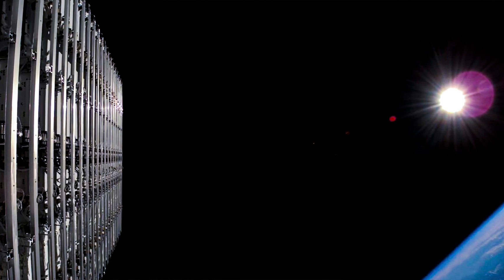 A close up view of spacex satellite hardware in low earth orbit with the sun shining brightly against the blackness of space and earths curve visible below