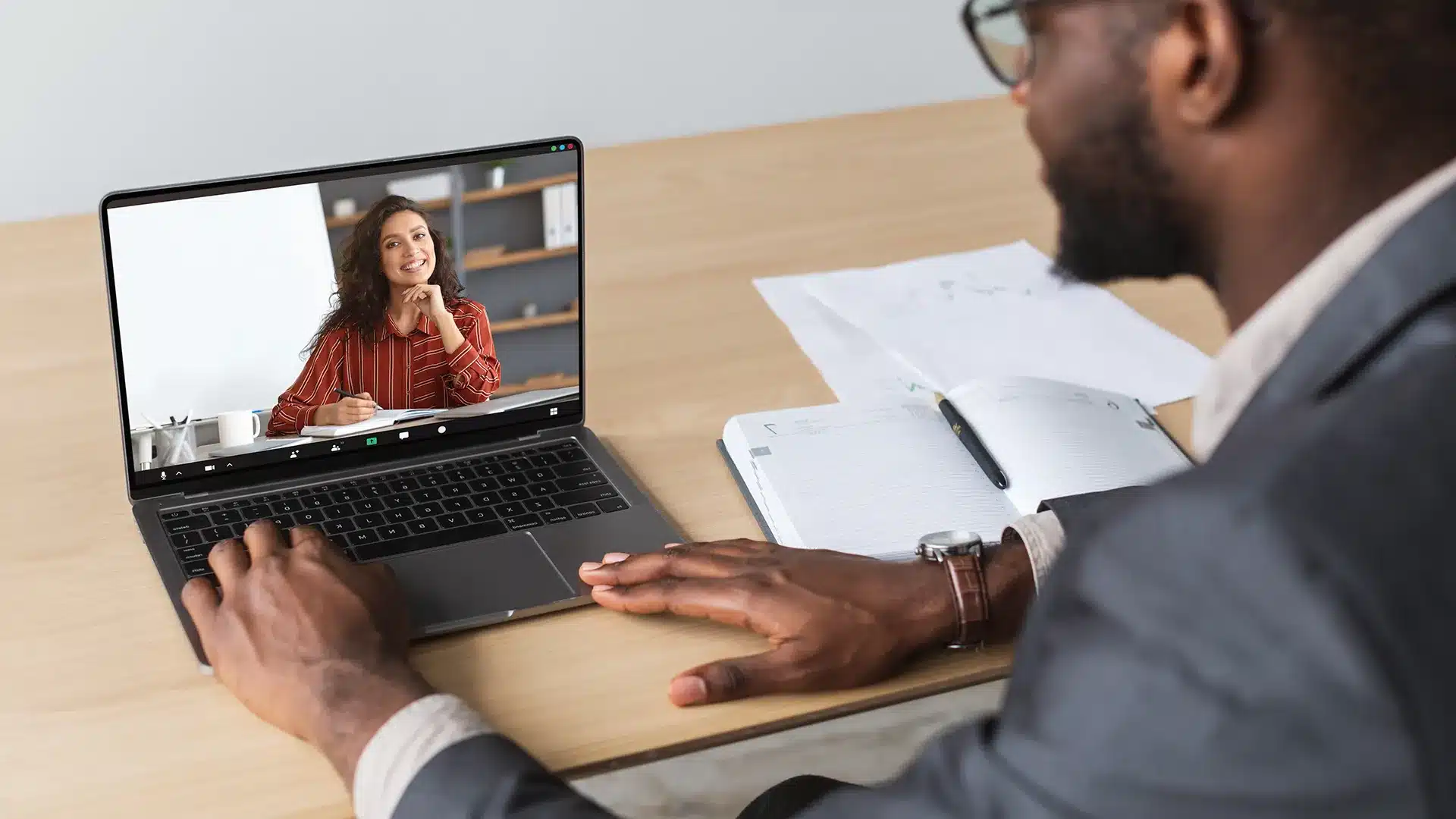 Business professional attending an online coaching session via video call on laptop